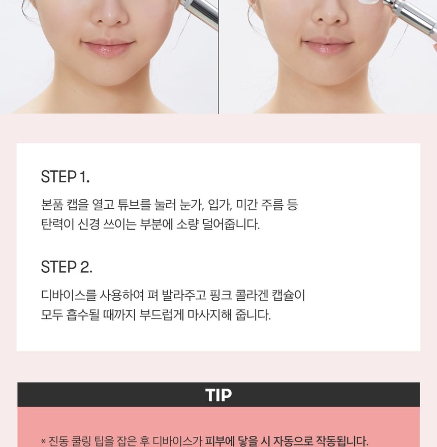 1. Open the product cap and press the tube, apply to areas where you are concerned about elasticity, such as around the eyes, mouth, and wrinkles between the eyebrows.