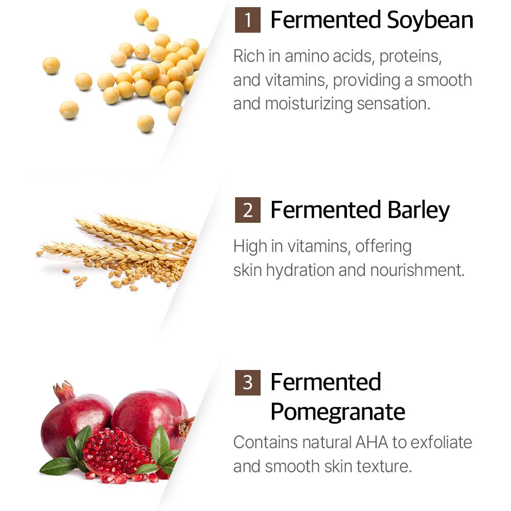 mixsoon's Signature Fermented Nutrients: A powerful blend of fermented soybean, barley, pear extract, and pomegranate to deliver long-lasting hydration and firmness, keeping your skin refreshed