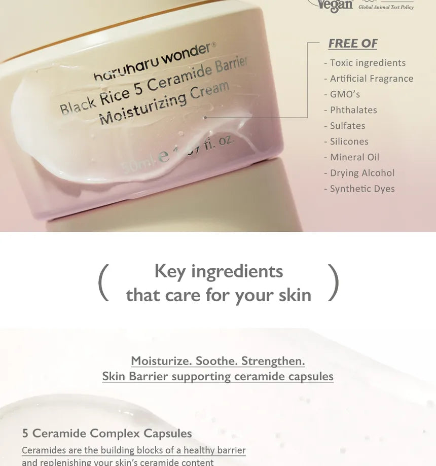 - A vegan moisturizing cream formulated with 5 Ceramide Complex Capsules to replenish moisture and prevent moisture loss, keeping skin plump and supple with eased irritation and inflammation.