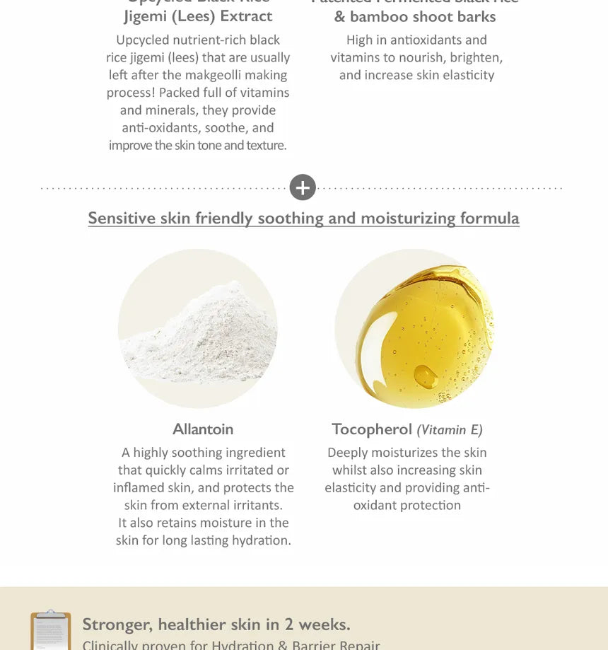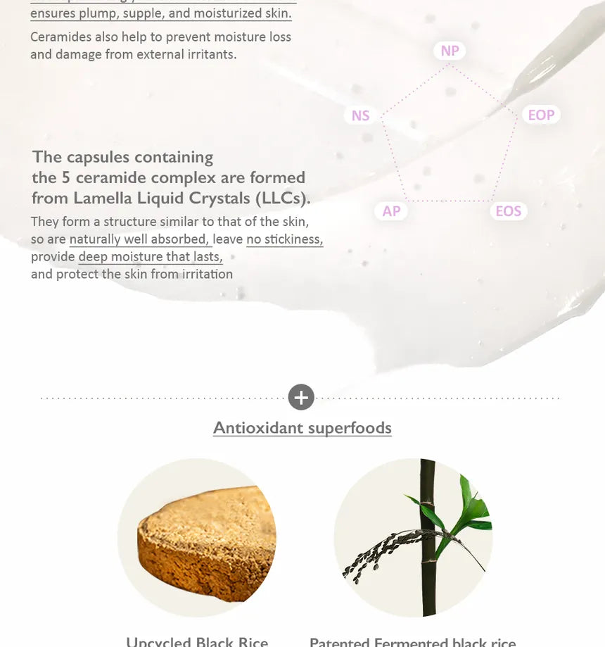 Water, Glycerin, Butylene Glycol, Caprylic/Capric Triglyceride, Dicaprylyl Carbonate, 1,2-Hexanediol, Ceramide NP (10,105ppm), Sodium Acrylate/Sodium Acryloyldimethyl Taurate Copolymer, Cetearyl Olivate, Polyisobutene, Hydrogenated Lecithin, Polyglyceryl-3 Distearate, Sorbitan Olivate, Cetearyl Alcohol, Carbomer, Arginine, Mannitol, Stearic Acid, Arachidyl Alcohol, Allantoin, Xanthan Gum, Behenyl Alcohol, Ethylhexylglycerin, Sorbitan Oleate, Caprylyl/Capryl Glucoside, Arachidyl Glucoside, Glyceryl Stearate Citrate, Hydrogenated Olive Oil Decyl Esters, Oryza Sativa (Rice) Extract (200ppm), Phyllostachys Pubescens Shoot Bark Extract, Disodium EDTA, Aspergillus Ferment, Hydrogenated Olive Oil Stearyl Esters, Ceramide NS (15ppm), Phytosphingosine, Cholesterol, Oryza Sativa (Rice) Lees Extract (10ppm), Panax Ginseng Root Extract, Tocopherol, Ceramide AS (5ppm), Ceramide AP (5ppm), Cyclodextrin, Ceramide EOP (0.01ppm)