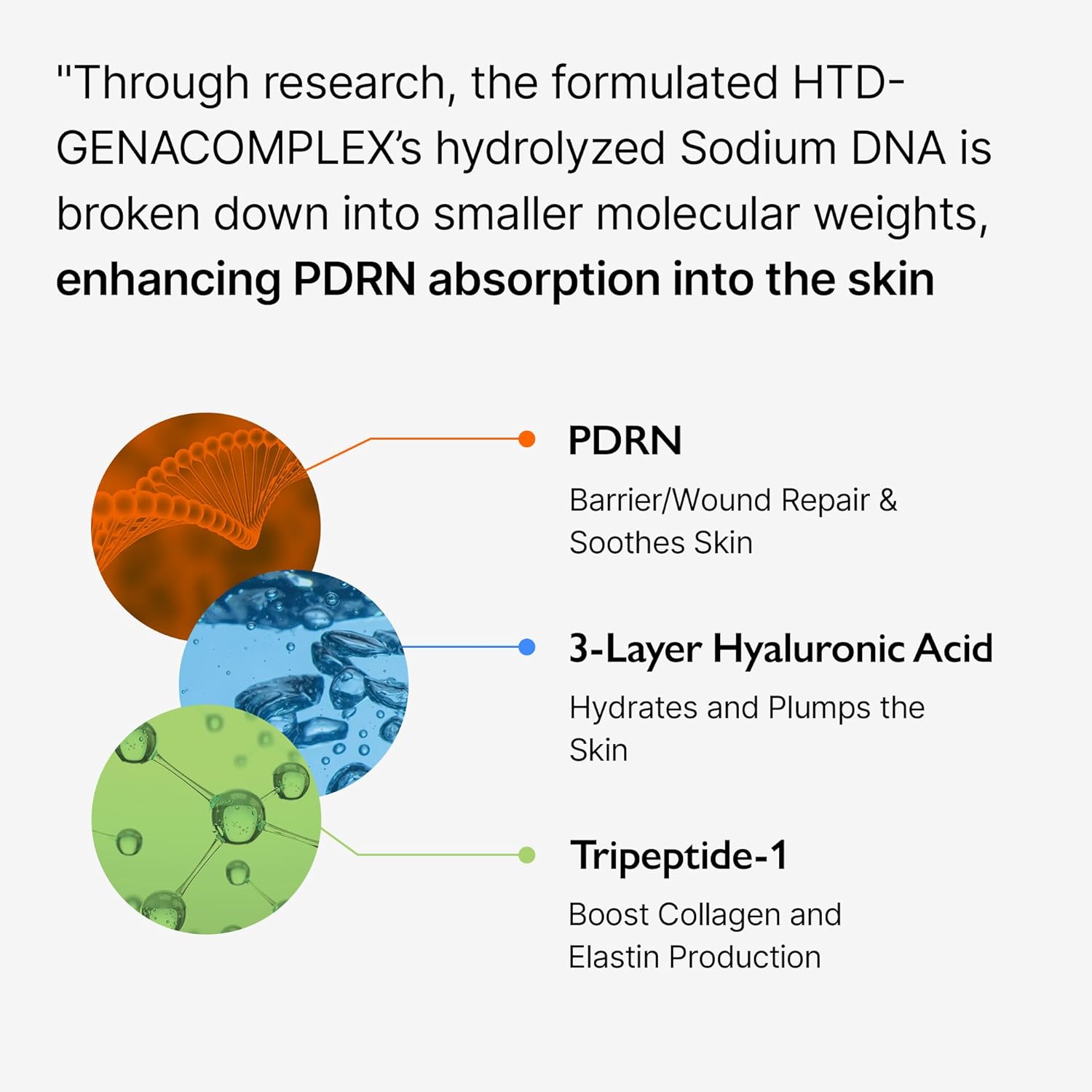 • HTD-GENACOMPLEX TM: A unique patented complex created with salmon DNA, 3 Layers of Hyaluronic Acid, and Tripetide-1. This combination dramatically improves skin elasticity, plumpness, and overall radiance.